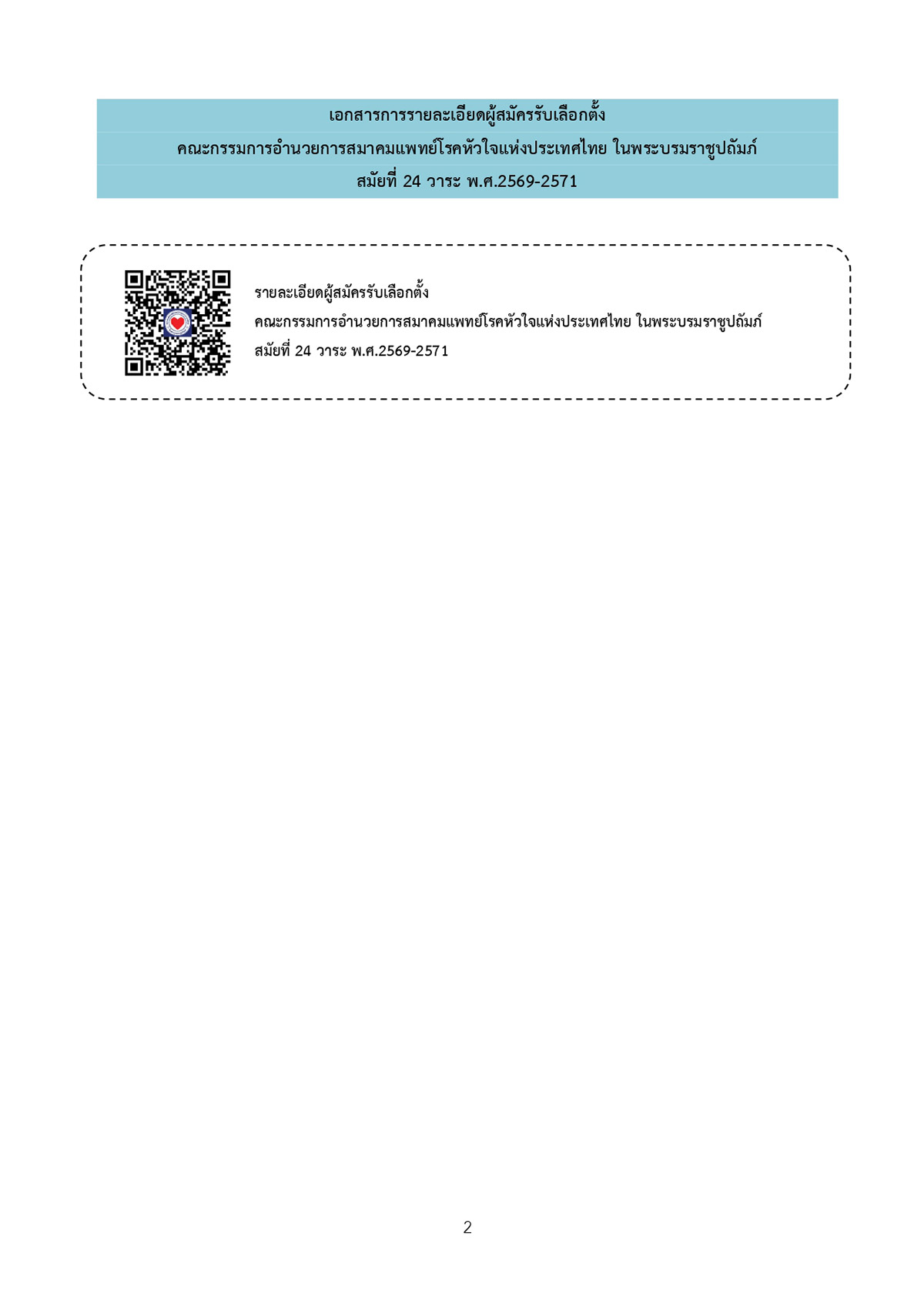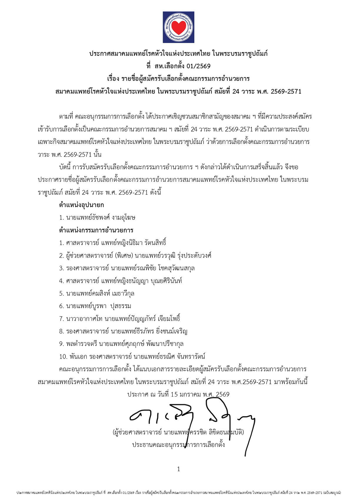 🤍ตามที่สมาคมแพทย์โรคหัวใจ ฯ ได้ประกาศสมัครรับเลือกตั้งคณะกรรมการอำนวยการสมาคมแพทย์โรคหัวใจแห่งประเทศไทย ในพระบรมราชูปถัมภ์ สมัยที่ 24 วาระ พ.ศ. 2569-2571 ซึ่งปิดรับสมัครเมื่อวันที่ 30 พฤศจิกายน 2568 แล้วนั้น ขอประกาศรายชื่อผู้สมัครรับเลือกตั้ง ฯ ดังนี้